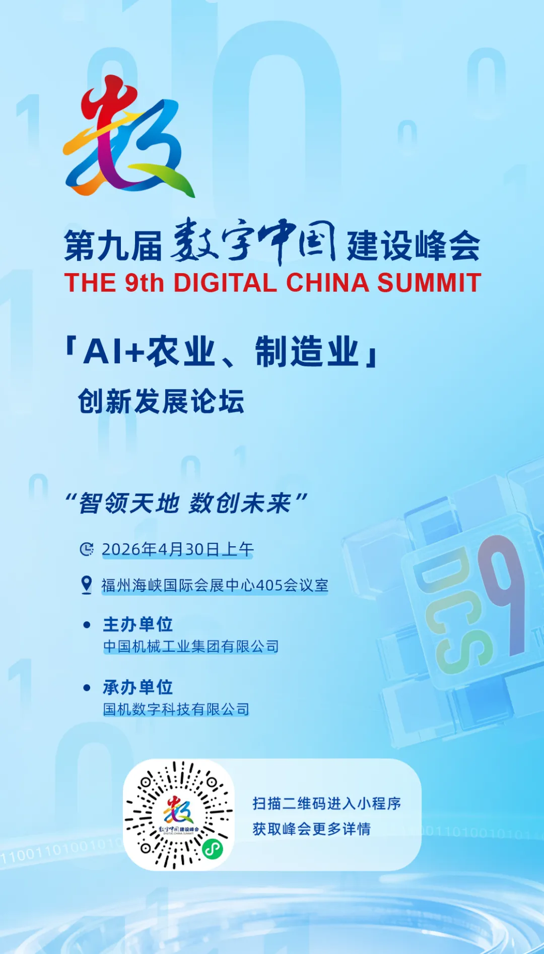 第九届数字中国建设峰会“智领天地 数创未来——AI+农业、制造业创新发展论坛”将于4月30日上午在福州海峡国际会展中心405会议室隆重举行。该论坛由中国机械工业集团有限公司主办,国机数字科技有限公司承办。