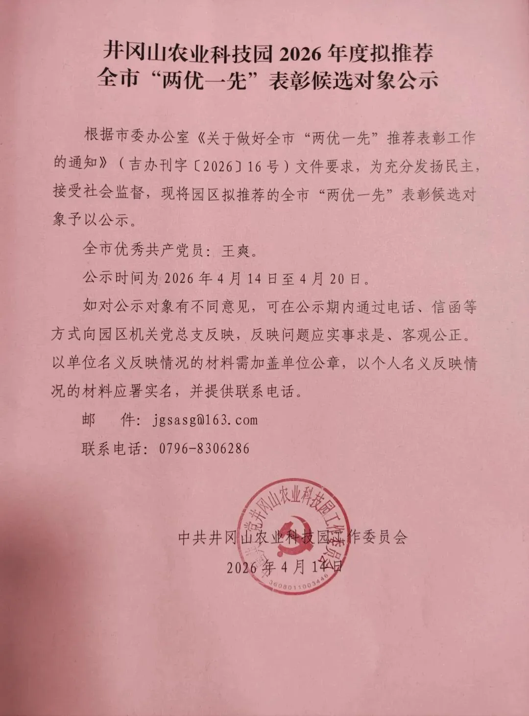 >井冈山农业科技园2026年度拟推荐全市“两优一先”表彰候选对象公示