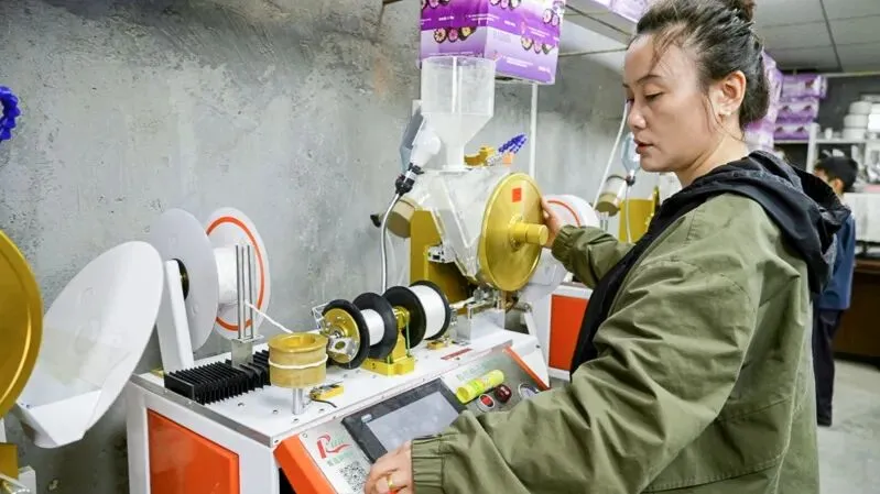 在新疆友联种植农民专业合作社,工作人员演示种子编织机的使用方法。