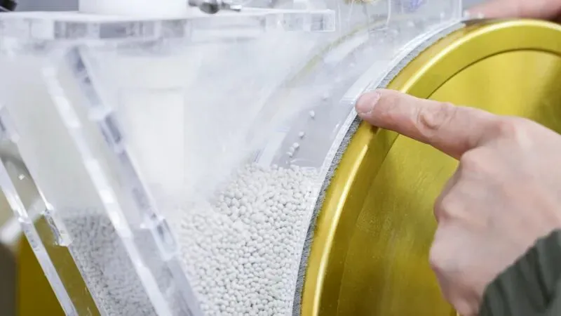 一粒粒细小的大葱种子缓缓落入旋转的离心机,在高速翻滚中,被药剂和粉料层层包裹。短短几分钟,原本形状不一、表面粗糙的种子,便穿上了一层“灰色防护衣”,变得圆润光滑、大小均匀,从机器另一端滚落。