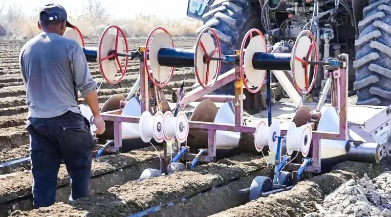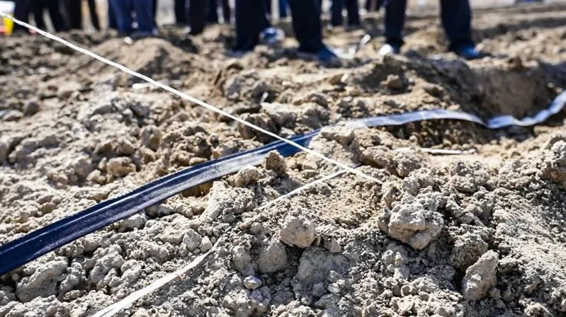 讲解过后,大家来到大葱播种现场。播种机正将编织进纸带的种子埋入地中。
