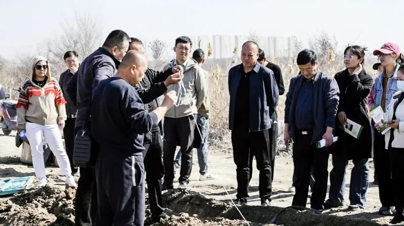 种植户在高新区(新市区)六十户乡八段村观摩大葱种子丸粒化处理及编织机械化播种技术。