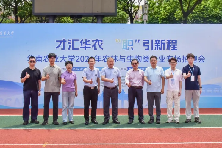 4月10日,由华南农业大学党委学生工作部(党委研究生工作部)主办,农学院、植物保护学院、林学与风景园林学院、园艺学院、资源环境学院、生命科学学院、国际教育学院(广州都柏林国际生命科学与技术学院)等7个农林与生物类学院共同承办,韶关学院学生工作部(招生与就业指导中心)协办的“才汇华农‘职’引新程”2026年农林与生物类行业招聘会在学校六一区运动场成功举行。