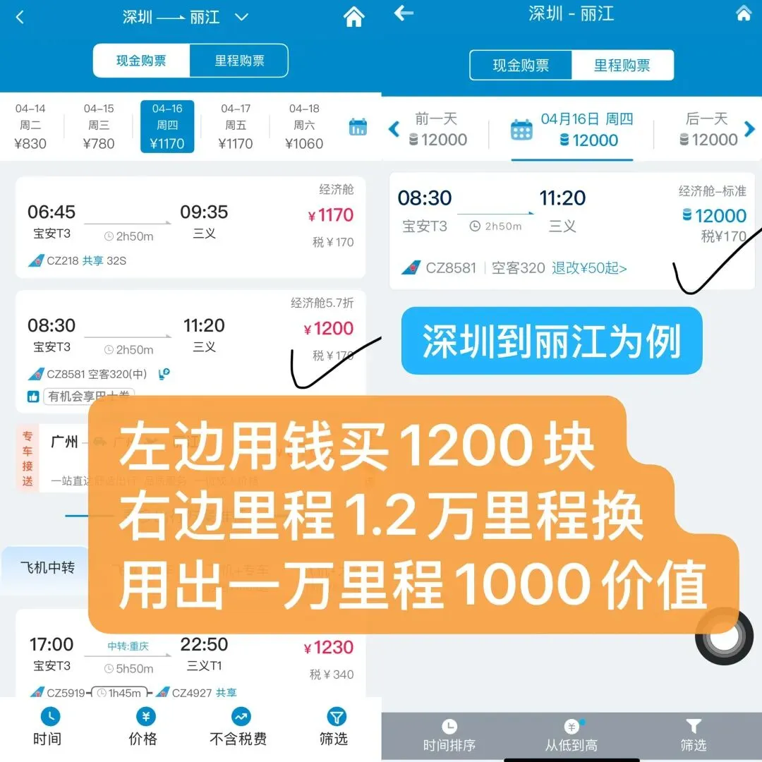 消费15万就有1万航空里程,价值就算转手起码都550+哦,成本才345(微信扫码消费1万是23手续费),1万里程有200差价了,或者你换算一万消费回36,成本是23,差13+............要是自用换机票,1万里程1000+价值也是有的,看你自己需求了,比如下面深圳飞丽江,现金买要1200块,里程换只需1.2万里程即可换!1万里程花出1000块的价值哦!对我们玩卡老司机的好处是,农行微信支付宝是有分的,卡神卡奴江湖这边拉卡拉渠道这些年在增量直接给你千万代理才有的政策成本一万是23(其实你们原来用的拉卡拉0.38,或者0.3,亦或者0.28 都是这个产品,只是你没找到我这个源头享受到低价而已),找到我就找到头了!狠人真的有人一个月刷几十万农行的,我们这有不少,卡一直都没事,银行风控很低能感知的出来!虽然这些年存刷抓的紧,但比如2万额度,你肯定不能一下子存个5万,10万进去刷,而是可用额度永远不大于2万,你刷的差不多再还进去那种就很好!而正常农行积分一万分是10块,你消费15万得的分也才150,差几倍呢!当然也有一些玩家结合常规的多倍,赠送的多倍,你消费一万得5倍积分也还ok,之前还可以换里程,如今缩减就不建议大家汇兑太多积分了!大头优先用航空联名卡最合适!南航明珠联名信用卡是中国农业银行股份有限公司与中国南方航空股份有限公司精心打造的集金融和商旅航空服务为一体的金融产品,倡导为南航会员及商旅人士提供更多实惠、创造更高价值。产品发行银联品牌和Visa品牌,境内用银联卡、境外用Visa卡,满足商旅人士境内外消费需求!当然真正的老司机一个银行是不会只有一张卡的,都是在积分换里程,或者联名卡中切换,同样的消费,得出不一样价值,发挥出该有的水平!用卡多的,从25年6月开始,会员等级那容易出邀请尊然白,有的话,基本就能直接加办尊然卡,我之前就是那会办的(因为我条件菜),条件好的可以直接去农行网点进件!之前积分可以25:1换里程,叠加一些多倍积分或者活动,就很爽,但是25年底后,农行积分换里程也限量,得靠抢,我们卡圈就理解为基本没啥用了,那么大家就不要去大量积累积分了,主要用航空卡最简单!农行一年下来活动是不少的消费4万返200,可以叠加!农行南航联名信用卡金卡就可以,没啥门槛,基本加申都批,但农行介意行数,多头授信,哪怕二卡也看征信,如果你行数太多了,或者总授信比较高(正常是可核实年收入的3倍),二卡有可能不批了!