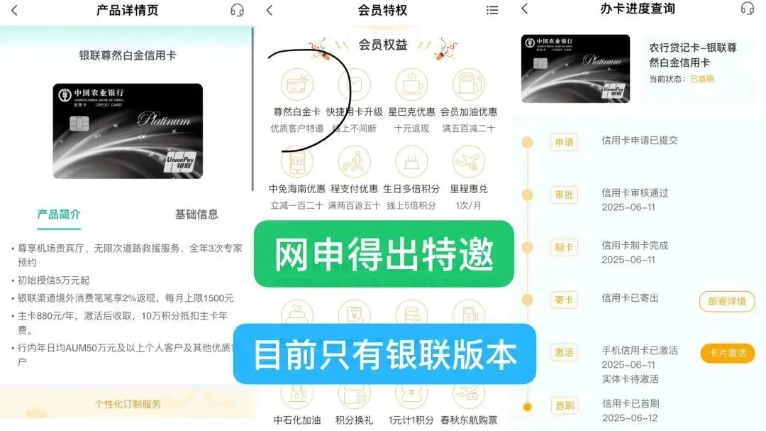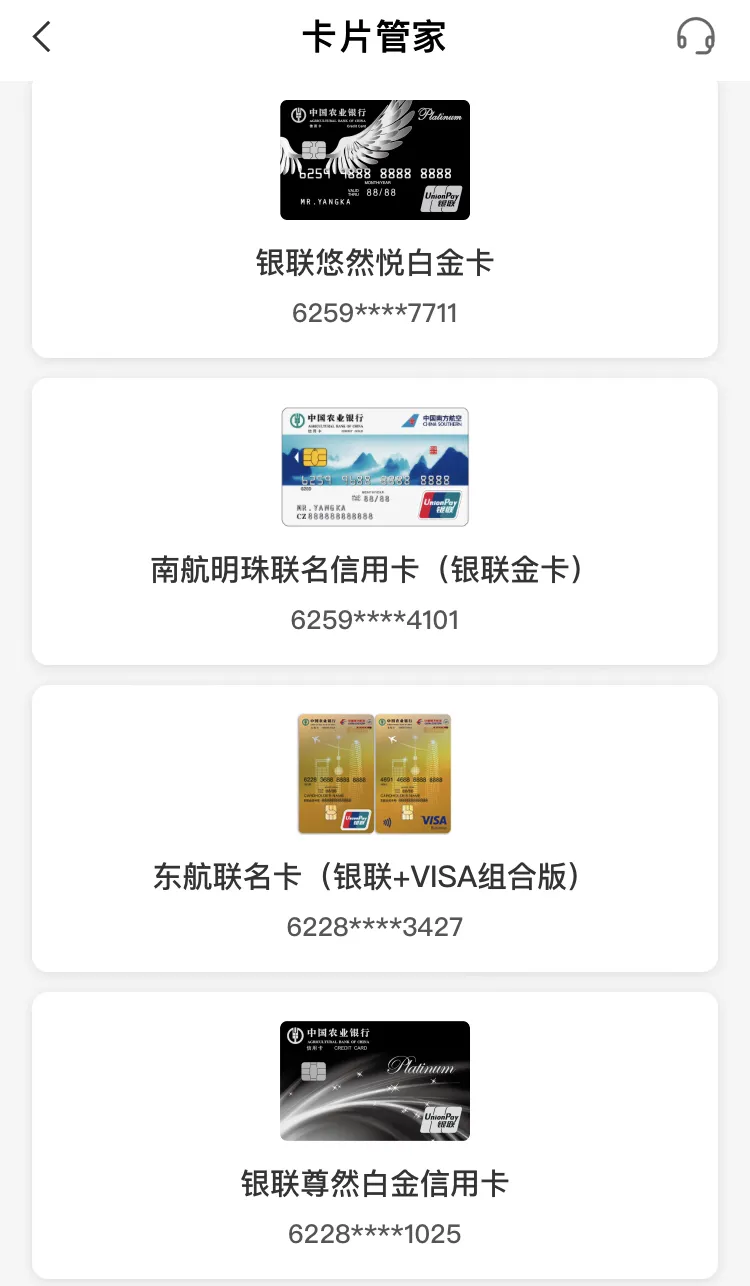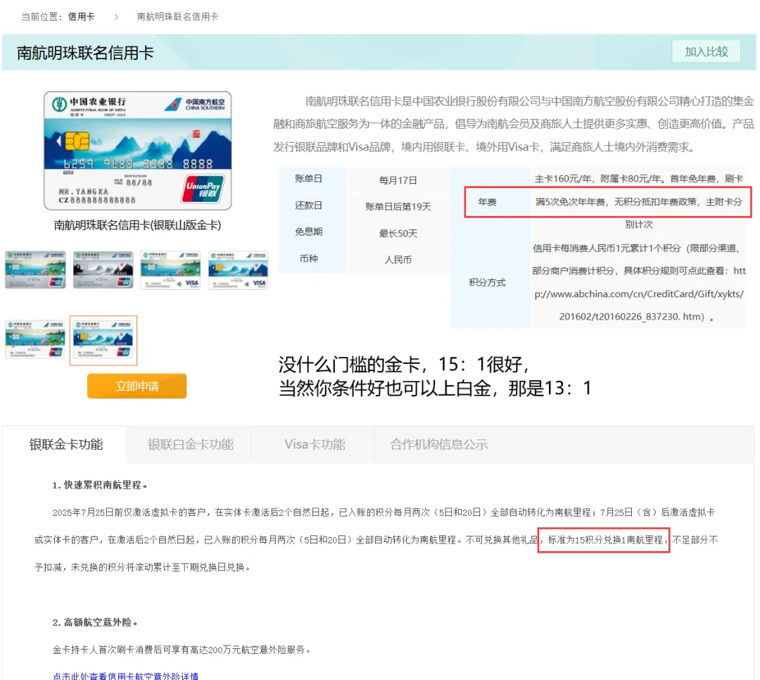 我手里有几张,农行我也很爱,是我第一家感受到屌丝也能逆袭的银行,曾经一年出头额度2万到10万给我很强的成就感,让我深刻体验到玩卡的好处(资金流)航空联名卡的意思简单理解就是你只管消费,所得积分每月会自动兑换到南方航空里,变成里程了,不用你手动去换,或者关注限量不限量,兑换比例变没变,非常傻瓜式操作,你算好账后几个月一次偶尔去南航里面看到账情况南航里程积累在那(3年有效期),多的换机票(可以自己也可以给别人),少的用不上哪怕那边换京东E卡也ok的,很方便了!
