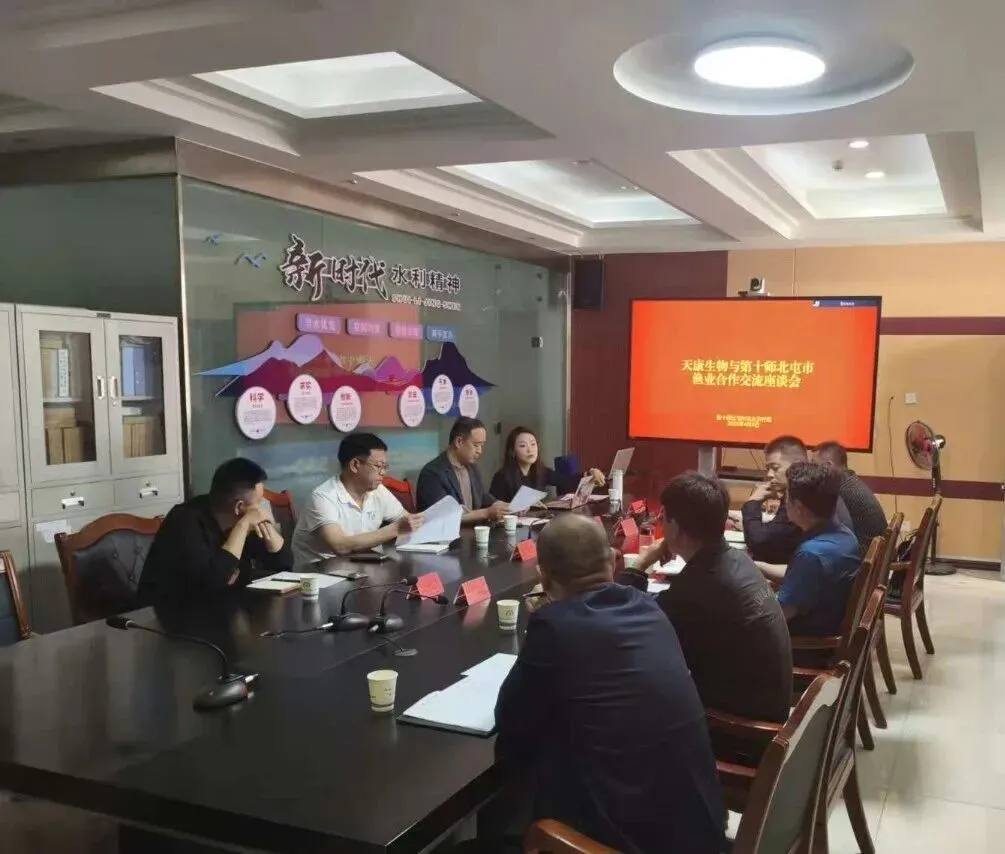 座谈会上,师市农业农村局立足师市水资源禀赋与产业基础,详细讲解了水产养殖概况,重点介绍了池塘标准化改造、苗种繁育基地建设、招商引资等相关政策。天康生物作为兵团国有控股龙头企业,分享了其在饲料研发、水产配套服务等方面的核心优势。