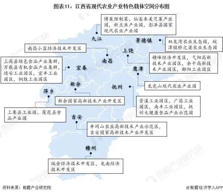 从空间载体区域分布来看,现代农业产业园、特色产业集群等主要集中在上饶、宜春、赣州、九江等地,南昌以科技与加工型园区为引领,抚州、景德镇、鹰潭、萍乡、新余等地则依托本地资源打造特色农业载体。