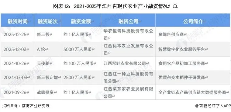 从现代农业产业融资情况来看,江西省现代农业产业融资活跃度较低。从融资轮次分布情况来看,涵盖天使轮、A 轮、战略投资及新三板挂牌/定增,融资覆盖饲料、种业、智慧农业、农产品供应链、初加工等核心赛道,资本重点支持粮食安全、智慧数字化与全产业链供应链建设。