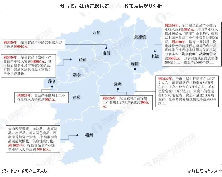 区域规划方面,江西省下辖市区,为贯彻落实省委、省政府决策部署,按照《江西省制造业重点产业链现代化建设“1269”行动计划(2023-2026年)》等有关工作部署,各自公布绿色食品等现代农业产业领域发展规划目标: