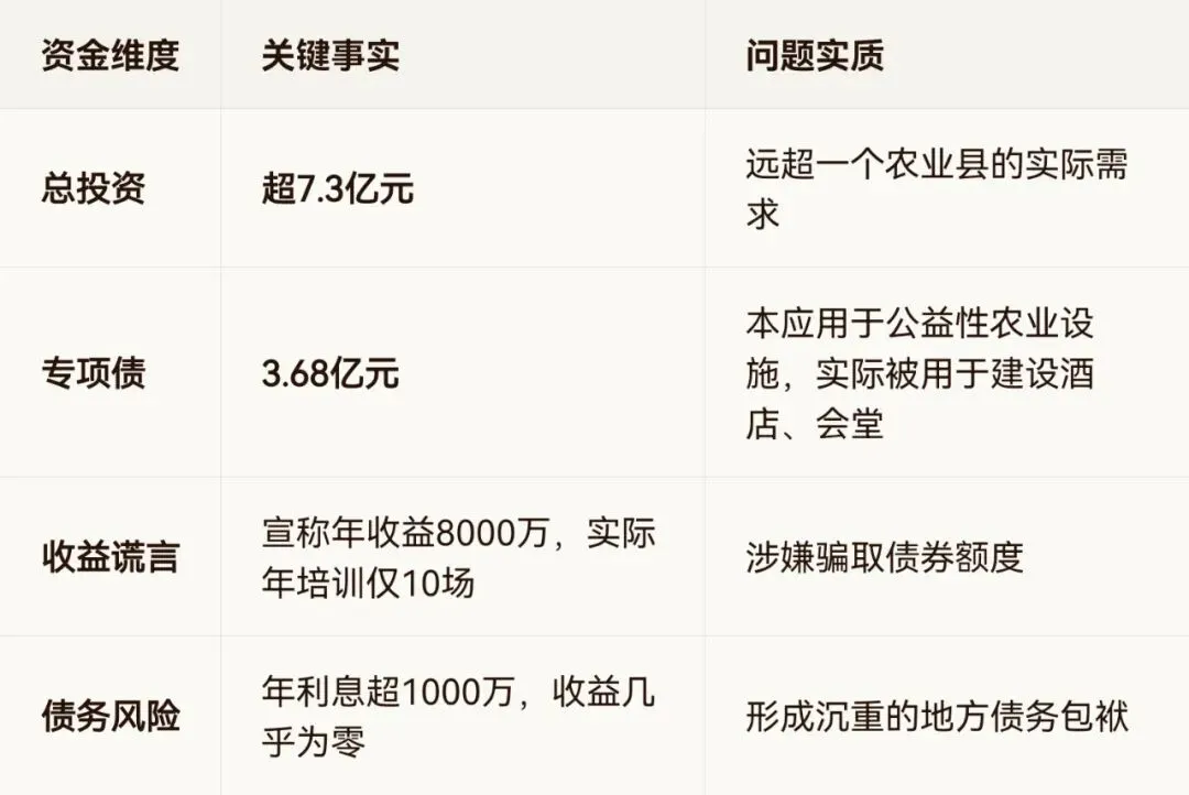 导语:4月14日,央视《焦点访谈》曝光了山东莒南县一起触目惊心的“挂羊头卖狗肉”工程。一个总投资超7亿元、举债3.68亿政府专项债的“现代农业公共实训基地”,实际竟是一个拥有酒店、棋牌室、健身房的高档综合体。民生工程为何异化为“伤民工程”?这背后不仅是形式主义,更是一场对公共财政的精准掏空。