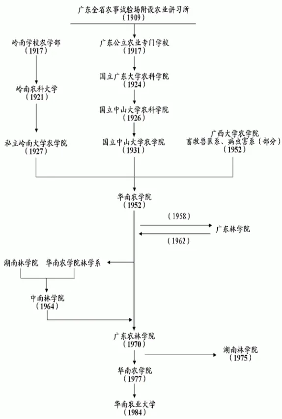抗战时期(1940-1945)国立中山大学搬迁至粤北办学,中山大学校本部设在坪石、农学院设在湖南栗源、武水演习林场设在大源细梨坑、私立岭南大学农学院设在乐昌坪石灵石坝,烽火中在粤北坚持办学。1952年全国高校院系调整时,由中山大学农学院、岭南大学农学院和广西大学农学院畜牧兽医系及病虫害系的一部分合并成立华南农学院,隶属农业部主管;毛泽东主席亲笔题写了校名。1984年,更名为华南农业大学。
