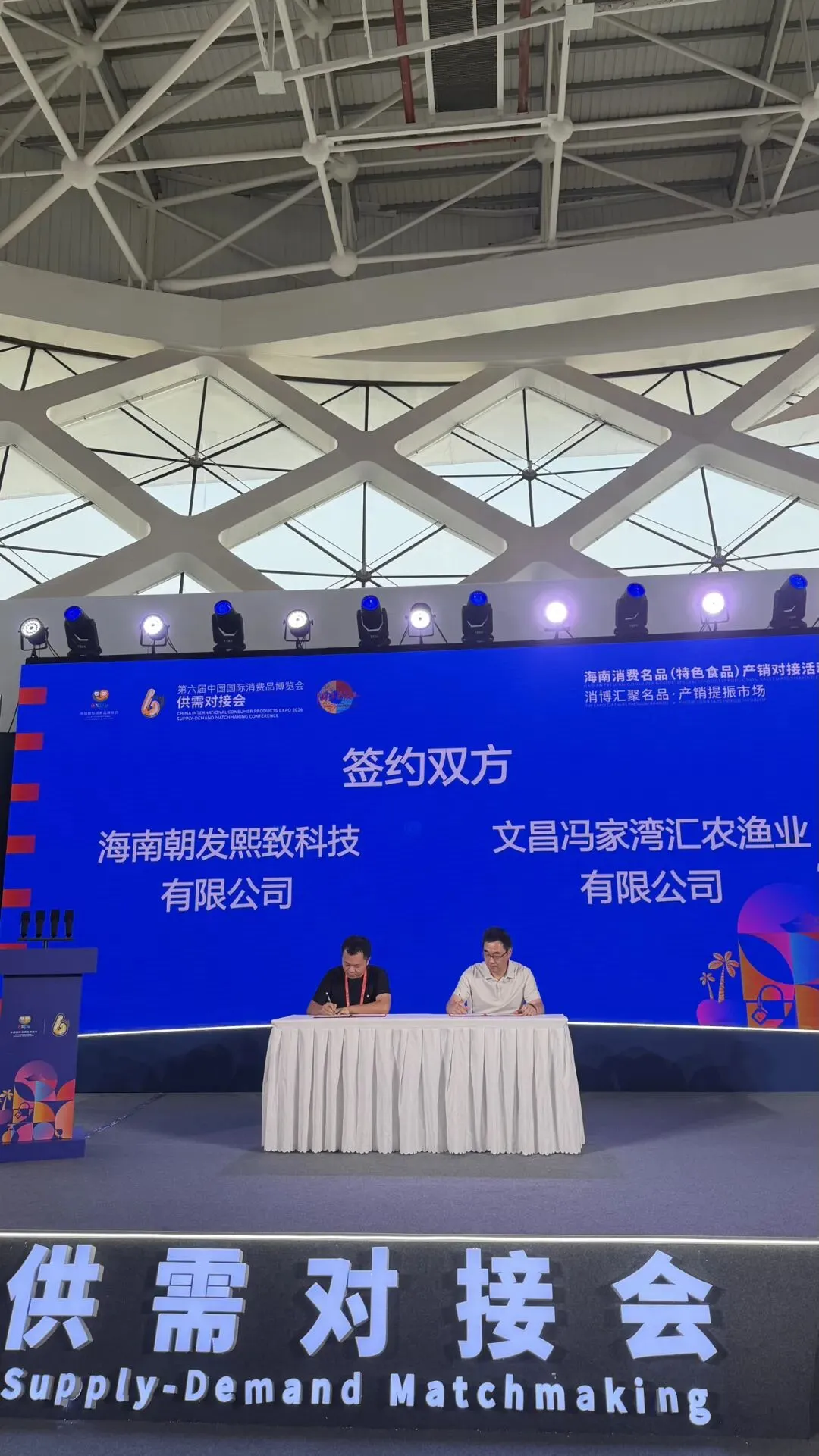 2026年4月13日,第六届中国国际消费品博览会海南消费名品(特色食品)产销对接专场活动在海南国际会展中心盛大启幕。文昌冯家湾汇农渔业有限公司与海南朝发熙致科技有限公司在供需对接会上隆重举行签约仪式,双方携手达成深度合作,为海南特色水产产业的产销融合、品牌升级注入全新动能!
