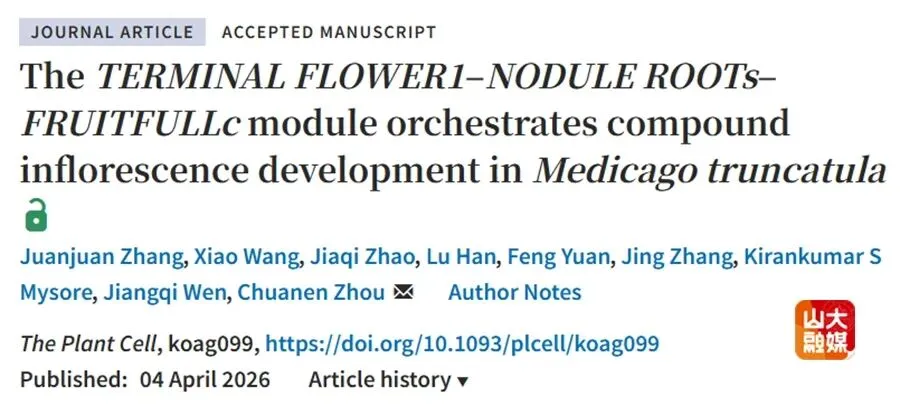 近日,山东大学生命科学学院周传恩教授团队在国际植物学期刊The Plant Cell发表题为“The TERMINAL FLOWER1–NODULE ROOTs–FRUITFULLc module orchestrates compound inflorescence development in Medicago truncatula”的研究论文。山东大学生命科学学院博士后张娟娟、王潇为共同第一作者,周传恩教授为通讯作者。