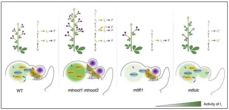 除了调控初级花序发育,研究团队发现MtNOOTs还深度参与了对次级花序的调控。野生型植株通常在一个节点处仅产生一个次级花序,但在mtnoot1 mtnoot2双突变体中,一个节点处往往会异常产生两个次级花序。遗传与分子实验揭示,MtNOOTs通过在转录水平上抑制次级花序分生组织决定因子MtFULc的表达,从而抑制额外次级花序的产生。此外,初级花序顶端分生组织决定因子MtTFL1能够显著增强MtNOOTs对MtFULc的转录抑制作用,二者协同参与次级花序形成的严格管控。