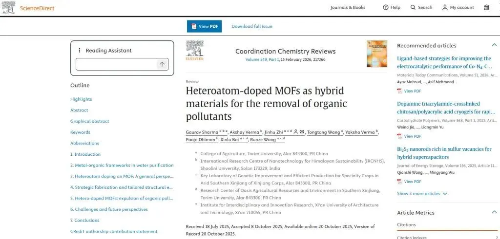 近日,塔里木大学农学院支金虎教授团队在国际顶级期刊《Coordination Chemistry Reviews》(长期位居中科院一区TOP期刊,最新影响因子为23.5)上发表题为“Heteroatom-doped MOFs as hybrid materials for the removal of organic pollutants”的研究论文。支金虎教授为该论文独立通讯作者,白新禄和王润泽博士参与了本研究,塔里木大学为第一完成单位。