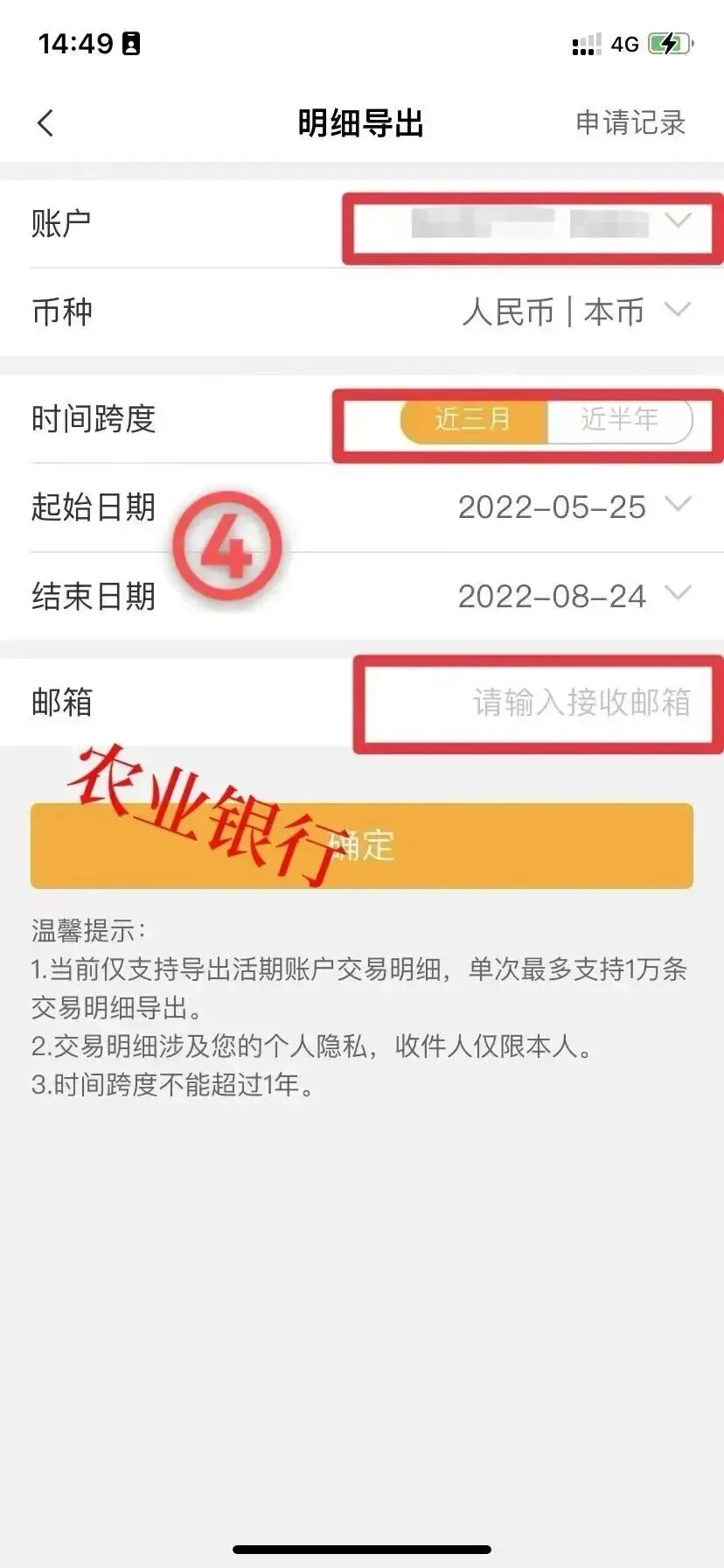 4.选账户、时间段、填接收邮箱 → 提交