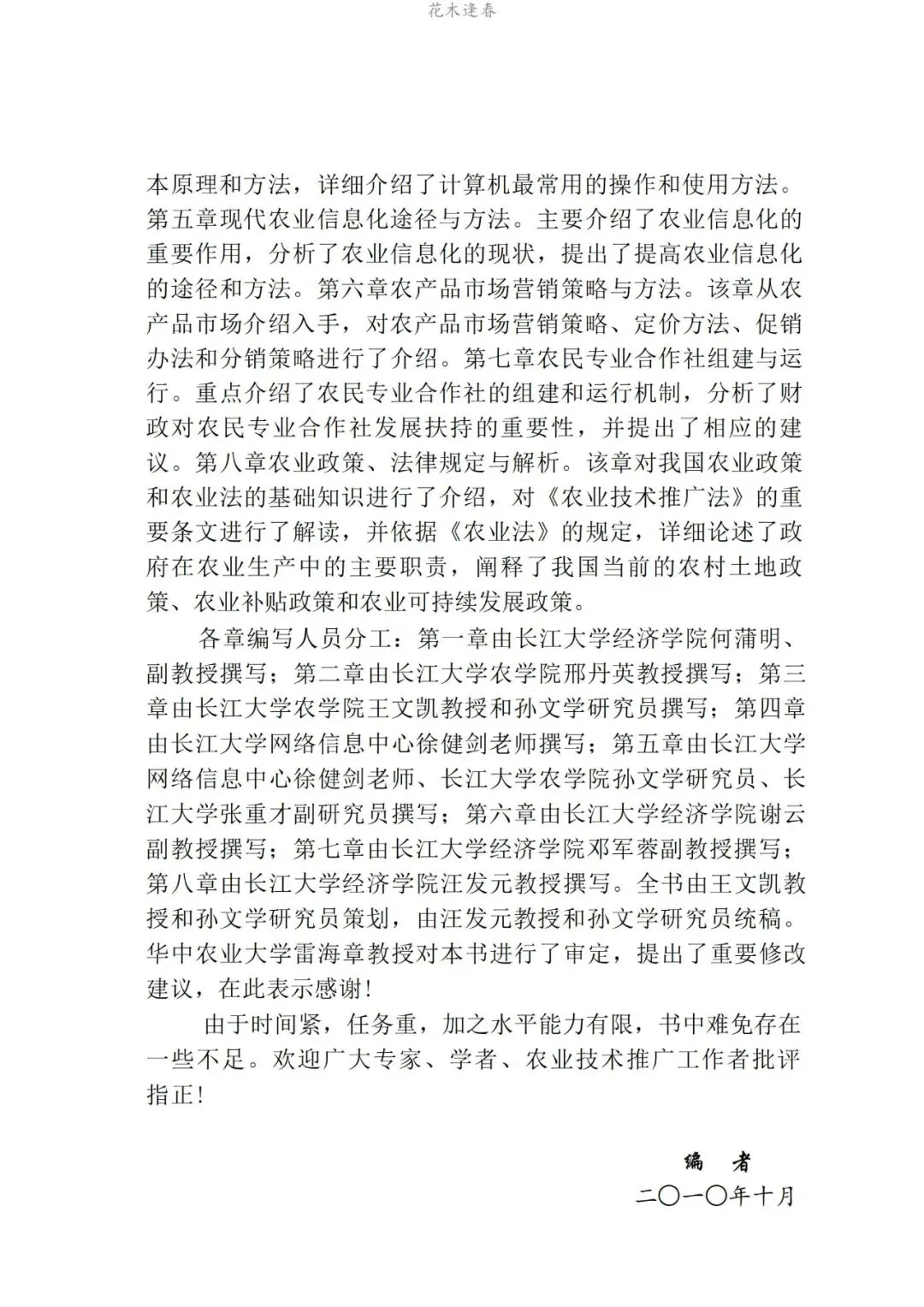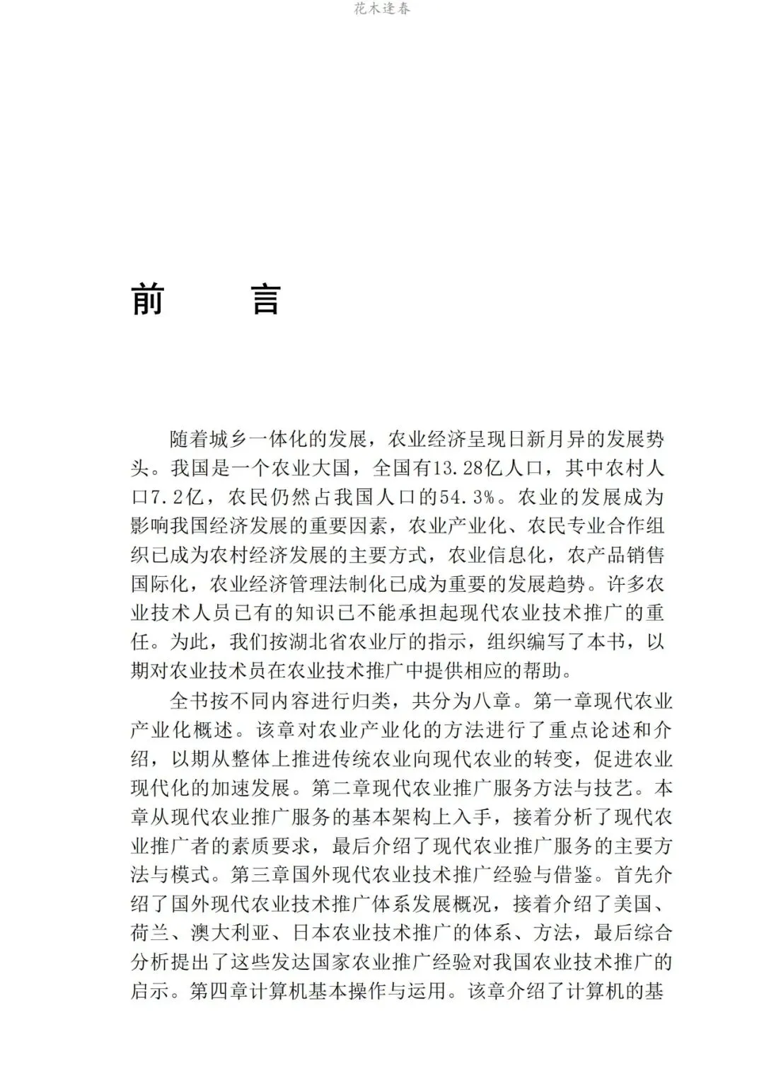 现代农业的发展对农业技术推广人员的知识和能力提出了更高的要求,随着时间的发展,很多农业技术人员的知识已经老化和单一,难以适应新形势下农业经济发展的需要和农业技术推广工作的要求。为此,本教材立足于新形势下农业经济发展的理论,结合农业经济发展的实际,首先阐述了现代农业发展必备的农业产业发展理论知识,农业技术推广知识,国外现代农业推广的经验及对我国的启示。其次,介绍了发展农业经济和从事农业技术推广工作必须具备的计算机知识,信息传播知识。再次,介绍了农产品营销知识,农业专业合作社组建和管理的知识。最后,对现行的农业政策规定,常用的与农业经济发展有关的法律、法规的内容进行了介绍和解析。本教材共分为八章,对一些重要的概念和规定进行了介绍,对常用的农业经济发展的知识和农业推广的方法和技巧进行了阐述,对必备的农业政策的内容和常用的法律、法规的规定进行了解析,以提高各级农业技术人员从事农业技术推广,发展农业经济的能力。本教材可供农业技术人员知识更新培训使用,也可供全国高等农林院校农林经济管理本、专科学生,农业推广硕士研究生使用。同时,还是全国从事农业技术推广的技术人员,从事农村经济工作的管理人员的工具书。