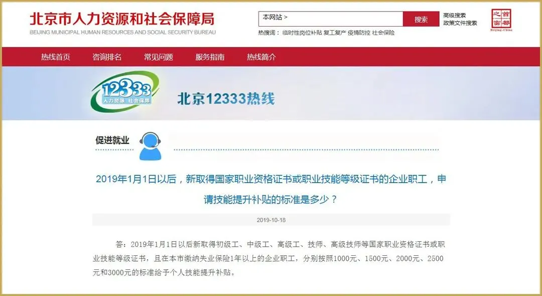 ● 北京市人力资源和社会保障局2019年1月1日后,职业技能等级证书,分别按照1000元、1500元、2000元的标准给予个人技能提升补贴。