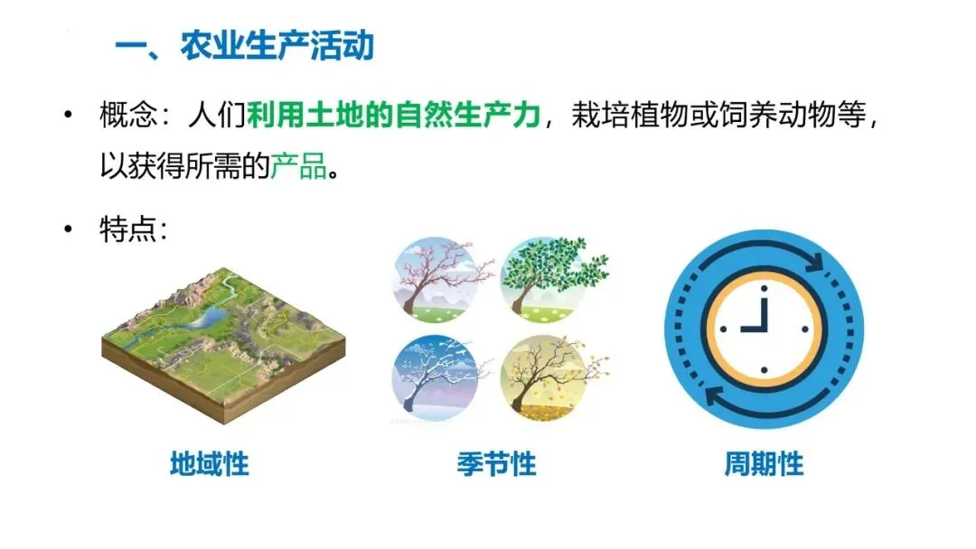 (1)概念:人们利用土地的自然生产力,栽培植物或饲养动物等获得所需产品的过程。