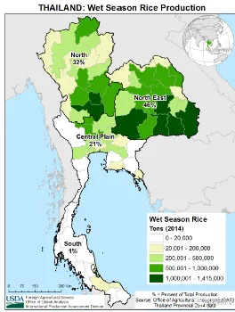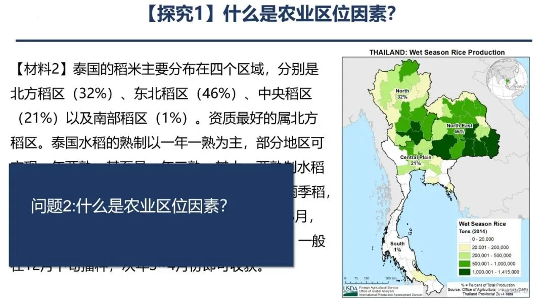【材料2】泰国的稻米主要分布在四个区域,分别是北方稻区(32%)、东北稻区(46%)、中央稻区(21%)以及南部稻区(1%)。资质最好的属北方稻区。泰国水稻的熟制以一年一熟为主,部分地区可实现一年两熟,甚至是一年三熟。其中,两熟制水稻的种植面积占总面积的20%左右,头季稻属于雨季稻,一般在5~6月份播种,有灌溉条件的推迟到7~8月,当年11~12月份相继收割。二季稻属于旱季稻,一般在12月下旬播种,次年3~4月份即可收获。