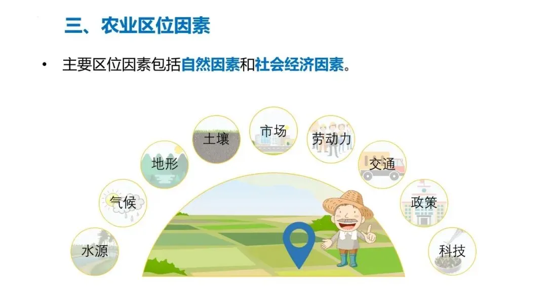 农业区位= 农业生产所选定的地理位置+农业与地理环境各因素的相互联系。 |