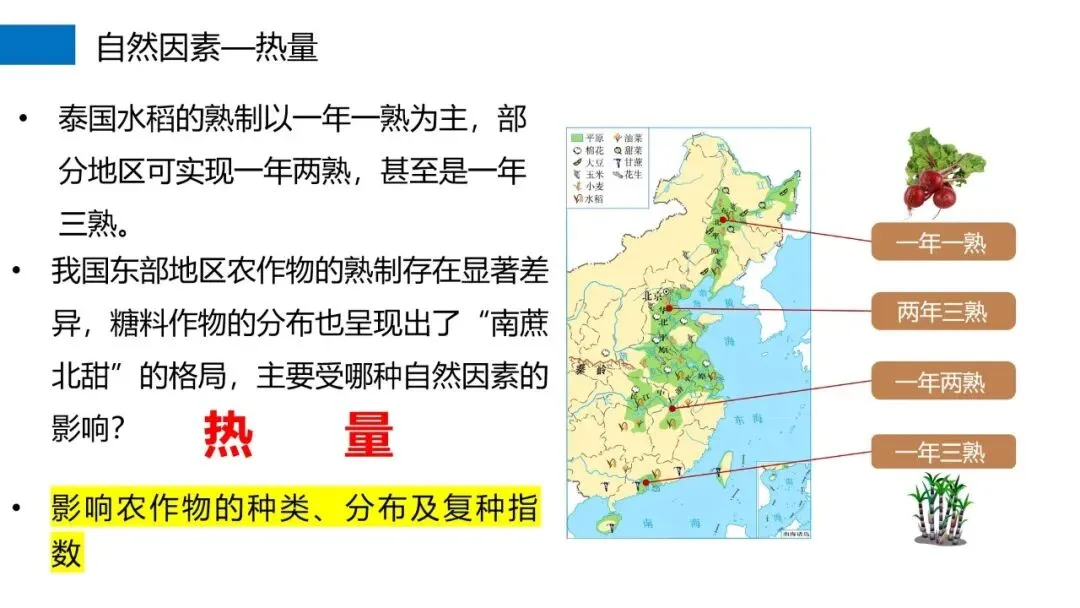 气候 | 热量 | 不同生物的生长和繁殖,要求不同的气候条件,而气候条件具有明显的地域差异 | 柑橘种植主要分布在南方地区,苹果种植主要分布在北方地区 |
