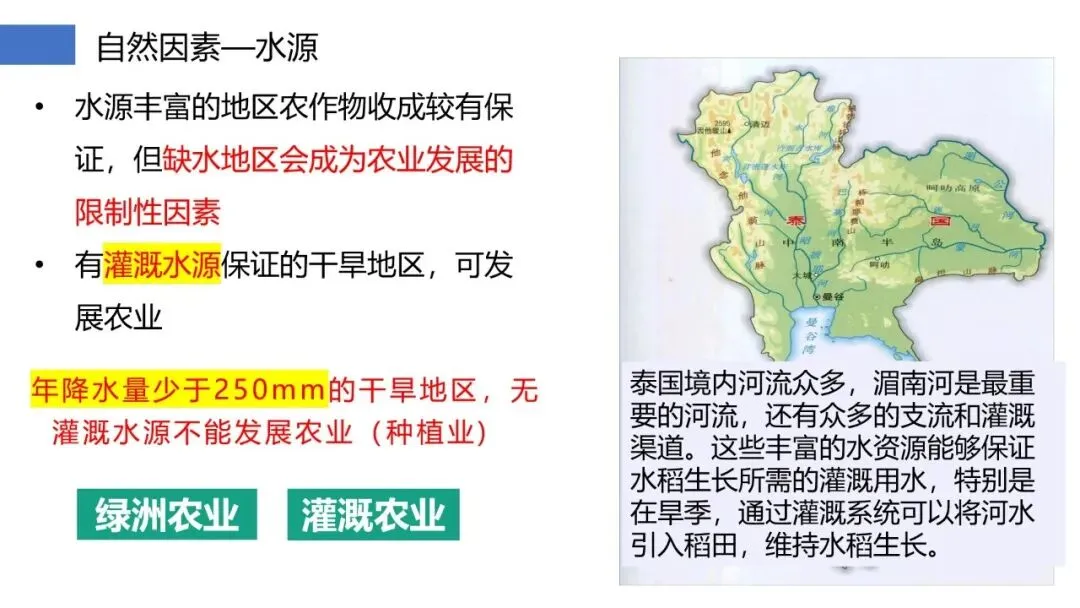 【材料4】湄南河平原位于泰国中部,是泰国的主要农业区,占据了泰国稻田的一半左右,产量占全国的五分之四,因此被称为“泰国谷仓”。湄南河是泰国最大的河流,其冲积作用形成了这片广阔的平原,使得这里成为泰国的中心腹地和经济最发达的地区。曼谷,泰国的首都,就位于湄南河的入海口地区。