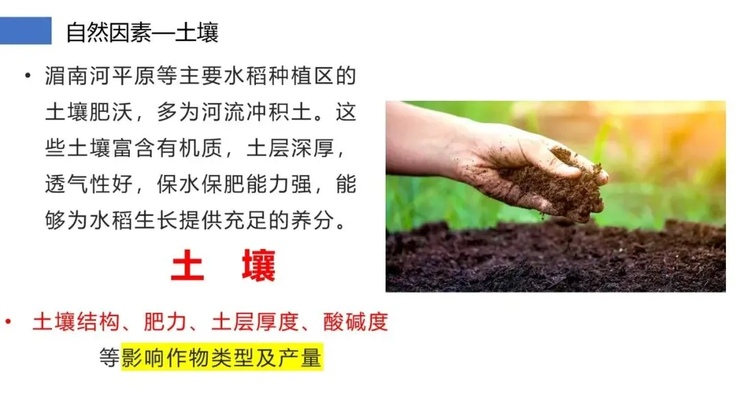土壤 | 不同类型的土壤,适宜生长不同的作物 | 东南丘陵酸性的红壤,适宜种植茶树 |