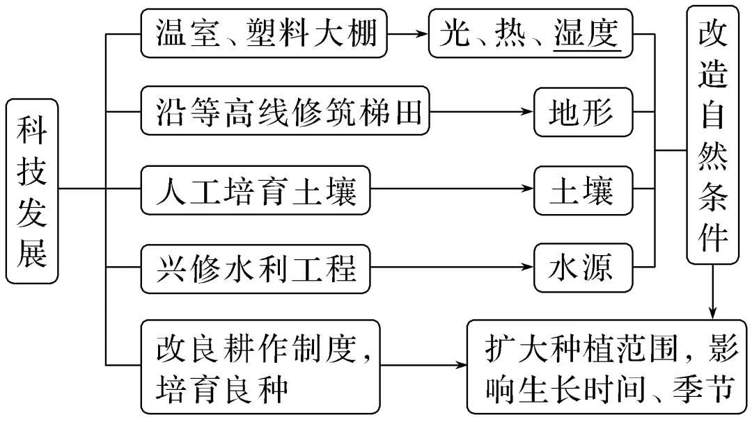 育种技术、栽培和耕作技术的进步 | 使农作物生产摆脱了传统地域的限制 | 水稻经品种改良,并采取室内育秧技术后,在东北也可种植 |