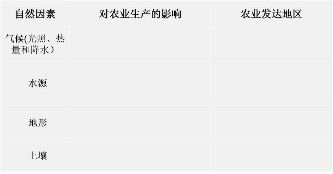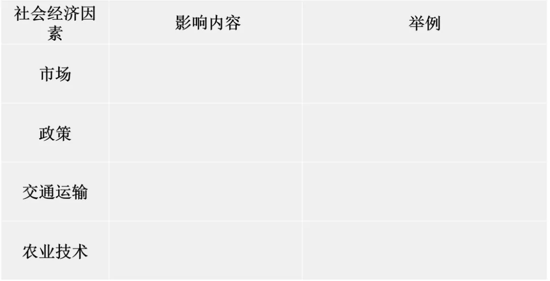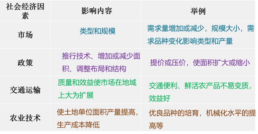 市场 | 市场的需求、农产品的价格决定了农业生产的类型和规模 | 大城市周围的乡村发展蔬菜、水果、肉、蛋、奶、花卉等农副产品的生产 |
