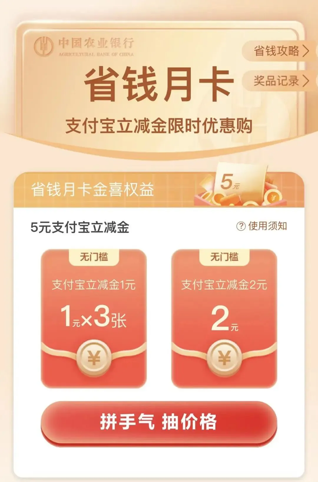 2026年4月,中国农业银行专属「省钱月卡」活动重磅上线,开盲盒抽优惠价就能买5元无门槛支付宝立减金券包,亲测身边朋友基本都是0.01元拿下,全国农行掌银注册用户都能参与,活动将于4月30日正式截止,80万份名额先到先得。