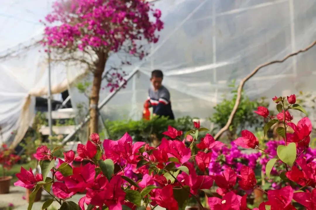 △碑楼村花卉大棚里,花农在为花卉浇水。
