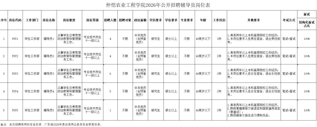 1.仲恺农业工程学院2026年公开招聘辅导员岗位表