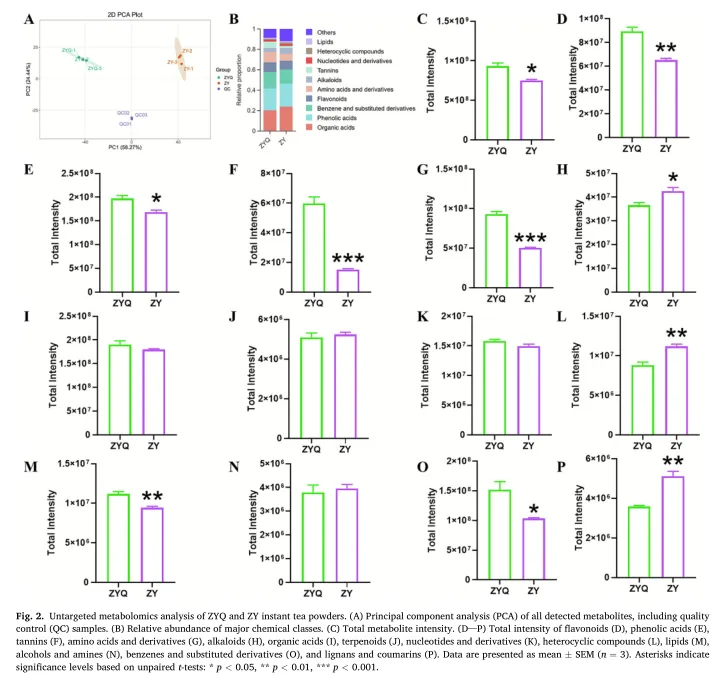 速溶茶粉是一种便捷、耐储存的产品,在全球范围内的受欢迎程度持续攀升,但茶树品种类型对其成分及功能的影响仍有待深入探究。本研究从代谢物谱、感官属性和抗炎效果三个方面,对绿叶茶树品种(ZYQ)和紫叶茶树品种(ZY)制备的两款速溶绿茶粉进行对比分析。代谢组学分析与感官评价结果显示,两款速溶茶粉具有显著的特征差异:ZYQ中表儿茶素、原花青素、总黄酮等物质含量更高,而ZY则富含花青素糖苷与表没食子儿茶素没食子酸酯(EGCG)。感官层面,ZYQ展现出更浓郁的鲜爽味、甜味,整体风味协调性更佳;ZY则苦味、涩味更显著,冲调后茶汤呈紫红色。在生物活性方面,两款速溶茶粉均能通过抑制核因子 -κB(NF-κB)通路与铁死亡相关的氧化应激,降低活性氧(ROS)、丙二醛(MDA)、铁离子水平及炎症介质含量,显著缓解脂多糖(LPS)诱导的RAW 264.7巨噬细胞炎症反应。其中,ZY能更显著地上调核因子E2相关因子2(Nrf2)、谷胱甘肽过氧化物酶 4(Gpx4)和硫氧还蛋白还原酶1(Txnrd1)的表达,表明其抗氧化防御能力更强。本研究结果表明,茶树品种的选择塑造了速溶茶的风味与生物活性,紫叶茶树品种制备的速溶茶产品具备独特的功能优势。