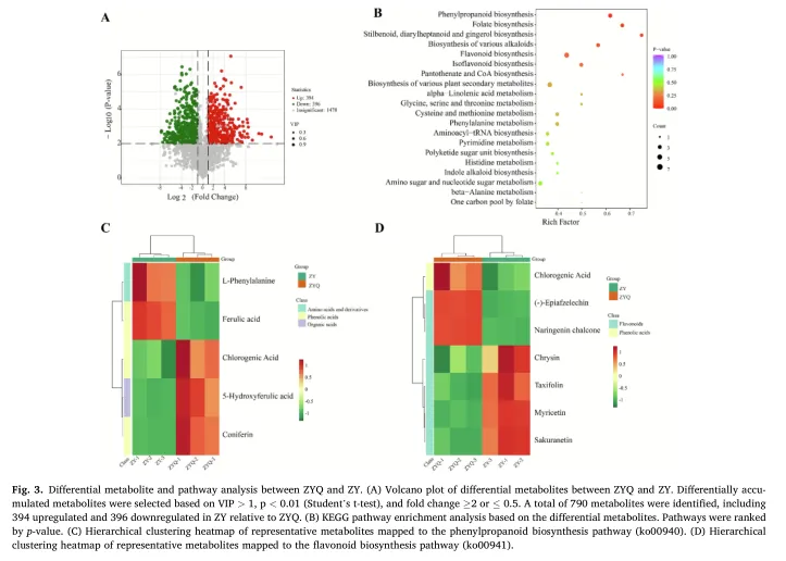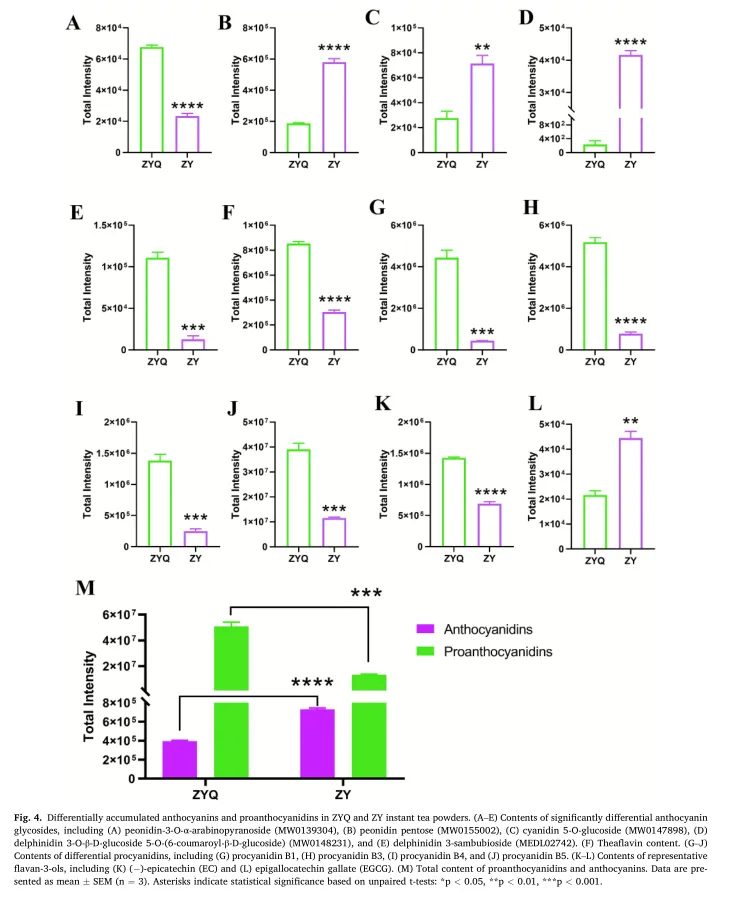 2、结合非靶向代谢组学与感官评价,建立速溶茶代谢成分与风味特征的关联,揭示花青素糖苷、EGCG等物质对紫叶茶粉苦味、涩味的贡献。