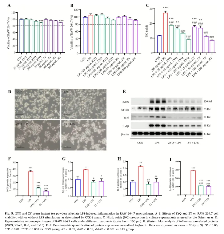 3、首次将速溶茶的抗炎活性与铁死亡机制结合,证实两款速溶茶粉均可通过抑制NF-κB通路、调节铁代谢与氧化应激缓解巨噬细胞炎症。