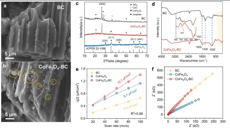 图 1.BC、CoFe₂O₄和CoFe₂O₄-BC的扫描电镜图像(a和b)、XRD谱图(c)、FTIR光谱(d)、电化学双电层电容(e)和EIS曲线(f)。