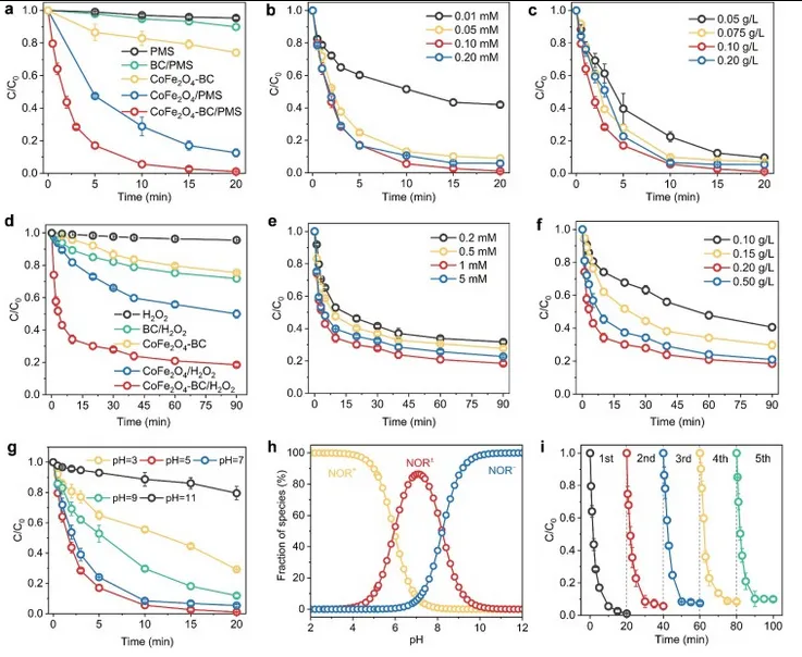 图 2.不同催化剂和PMS体系对NOR的去除效果(a),CoFe₂O₄-BC/PMS体系中PMS浓度(b)和催化剂投加量(c)的影响;不同催化剂和H₂O₂体系对NOR的去除效果(d),CoFe₂O₄-BC/H₂O₂体系中H₂O₂浓度(e)和催化剂投加量(f)的影响;CoFe₂O₄-BC/PMS体系中初始pH对NOR去除的影响(g),不同pH下NOR解离物种的分布(h),以及CoFe₂O₄-BC作为催化剂降解NOR的可重复使用性(i)。