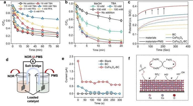 图3.活性氧淬灭剂在CoFe₂O₄-BC/H₂O₂(a)和CoFe₂O₄-BC/PMS(b)体系中对NOR去除的影响,开路电位曲线(c),双室原电池系统示意图(d),双室原电池系统的i-t曲线(e),以及CoFe₂O₄-BC活化PMS/H₂O₂降解NOR的机理示意图(f)。