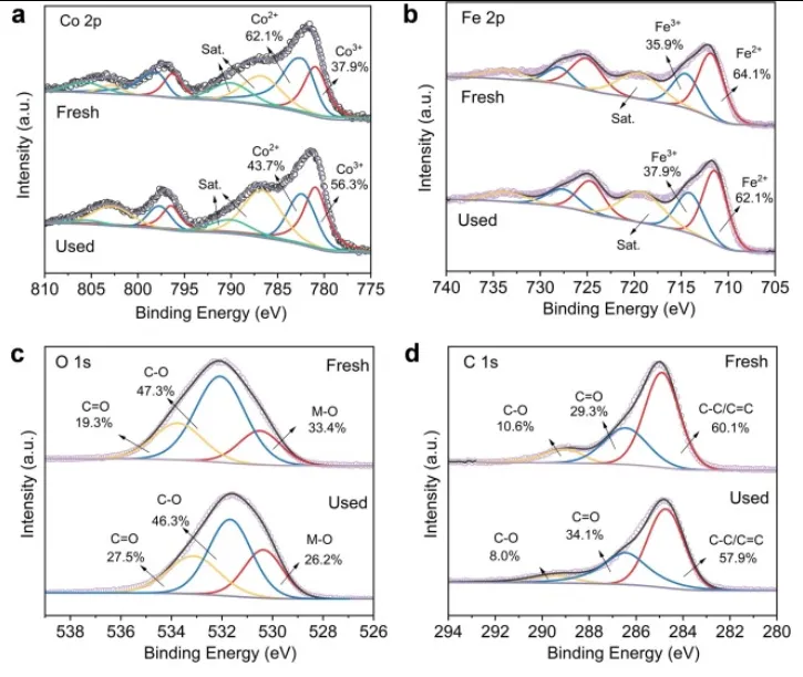 图4.原始和使用过的CoFe₂O₄-BC的Co 2p(a)、Fe 2p(b)、O 1s(c)和C 1s(d)XPS谱图。