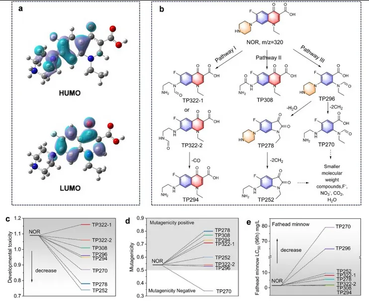图5.NOR的HOMO和LUMO分布(a),CoFe₂O₄-BC/PMS体系中NOR降解过程中提出的转化途径(b),NOR及其转化产物的发育毒性(c)、致突变性(d)和黑头呆鱼毒性(e)。