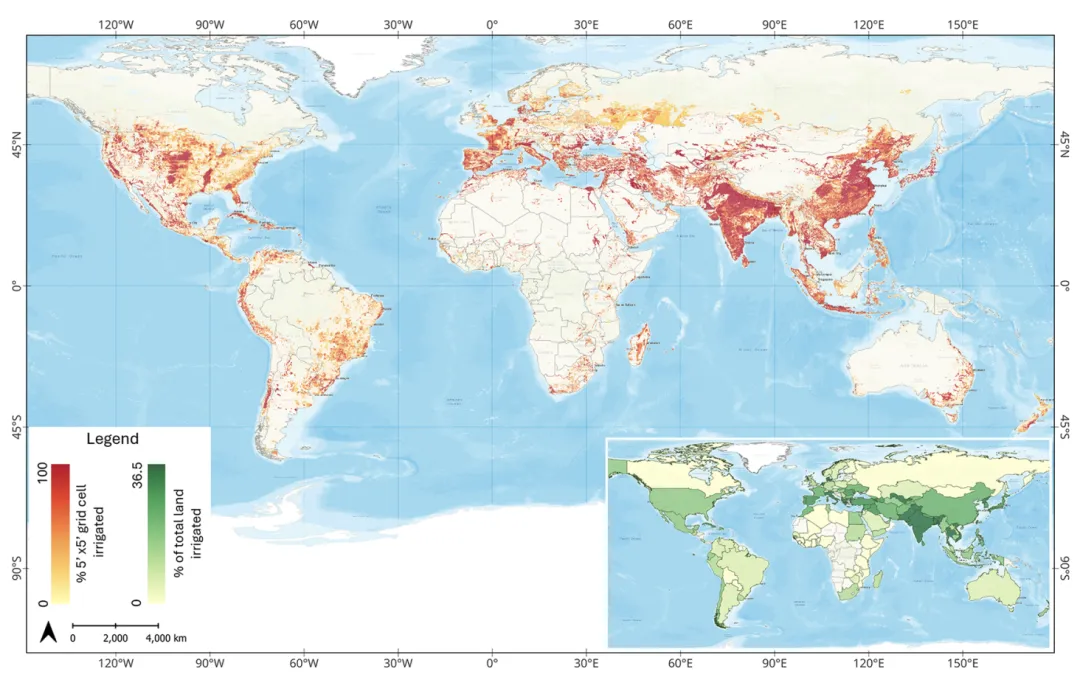 图1. 全球灌溉覆盖比例(红色网格为高灌溉区域,绿色为