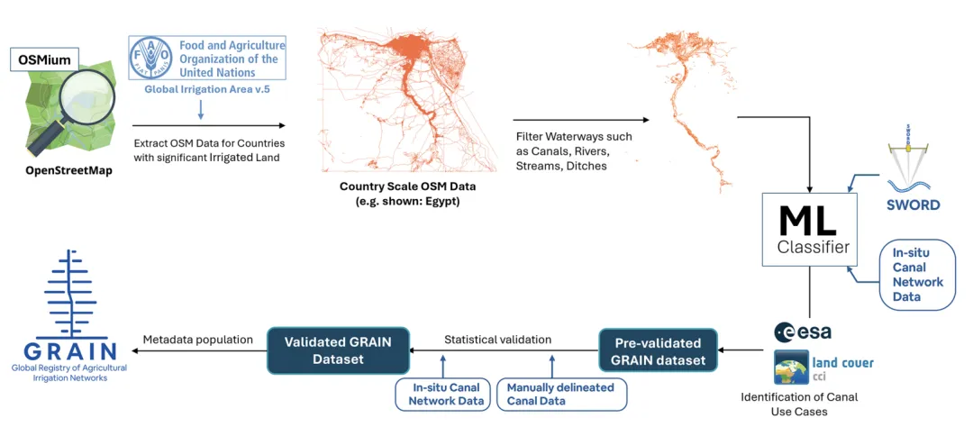 尽管灌溉渠道支持了全球约40%的农业产出,但在全球地理空间数据库中,这类表面水灌溉渠道仍存在显著的数据缺口。目前尚无统一、系统的数据库记录灌溉渠道的分布。GRAIN(Global Registry of Agricultural Irrigation Networks)数据集旨在填补这一空白,其方法是利用 OpenStreetMap OSM的志愿地理信息(VGI),并结合基于机器学习的分类管线,将灌溉渠道与河流、溪流区分开来。