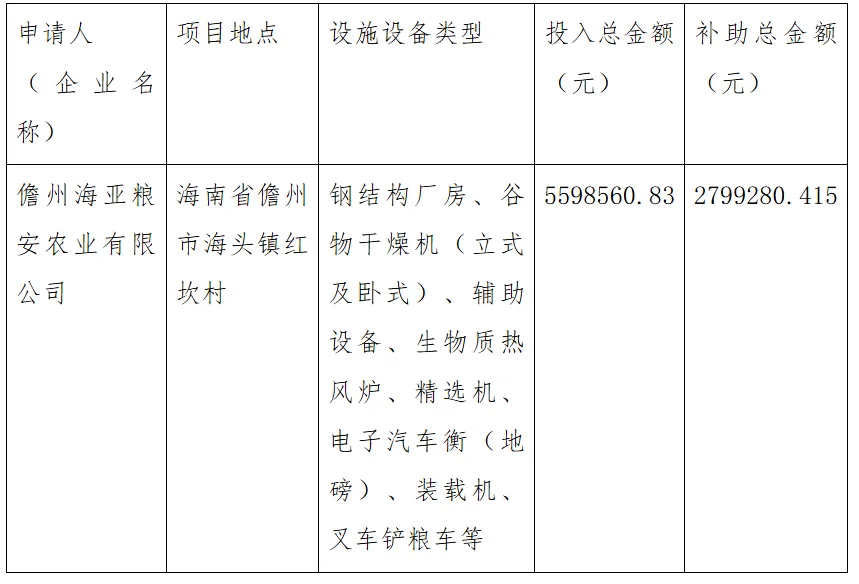 索引号:68725389-8/2026-00119分 类:农业、林业、水利、气象发文机关:儋州市农业农村局成文日期:2026年04月14日文 号:无发布日期:2026年04月14日时效性:有效 根据《儋州市农业农村局 儋州市财政局关于印发<儋州市2025年稻谷加工配套设施设备奖补项目实施方案>的通知》(儋农〔2025〕367号)和《儋州市农业农村局关于<儋州市 2025 年稻谷加工配套设施设备奖补项目实施方案>补充的函》(儋农函〔2025〕395号)文件要求,经实施主体申报,村、镇审核,市农业农村局委托专家并会同镇政府(办事处)验收,拟对2025年新建稻谷加工配套设施设备项目建设主体儋州海亚粮安农业有限公司给予补贴。该项目结算审核金额为5598560.83元,根据《儋州市2025年稻谷加工配套设施设备奖补项目实施方案》,按建设主体实际总投入金额的50%发放补贴,共需拨付该公司项目奖补资金共计2799280.415元。现将有关情况(见下表)进行公示,公示3天(2026年4月14日﹣2026年4月16日),请社会各界予以监督,若有异议,欢迎来电反映,联系电话:0898-23862980。