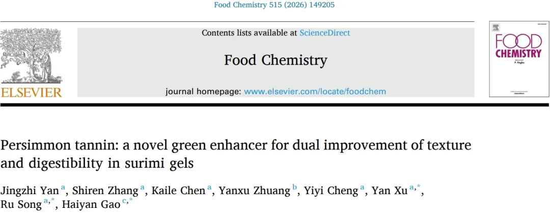 浙江海洋大学宋茹教授|浙江省农业科学院郜海燕研究员团队发现柿单宁是一种新型绿色增强剂,可同步提升鱼糜凝胶的质构特性与消化率