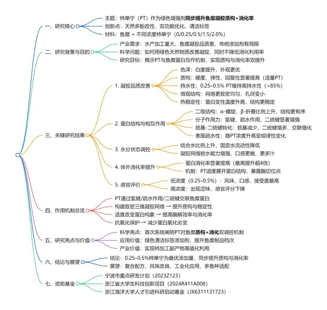 未来可基于该研究进一步优化柿单宁的应用形式,如复配、包埋等,降低高浓度下的涩味影响,拓展适用范围;深入解析柿单宁与不同鱼种鱼糜蛋白的互作差异,提升技术普适性;结合流变、光谱及组学技术,更精准揭示动态交联机制。同时可推进中试验证与产业化示范,推动这项绿色技术真正落地,助力水产加工业向高品质、低损耗、高值化方向升级。
