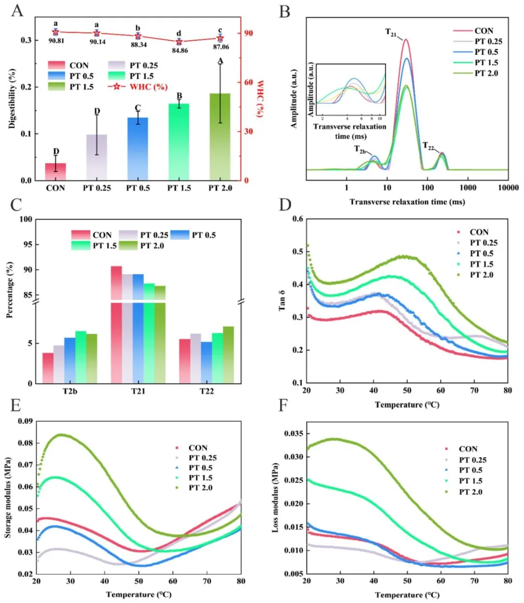 图文赏析图 1 不同添加量柿单宁(PT)鱼糜凝胶的持水性与体外消化率 (A)、低场核磁共振波谱 (B)、水分分布状态 (C) 及动态流变特性 (D:损耗角正切 tanδ;E:储能模量 G';F:损耗模量 G'')