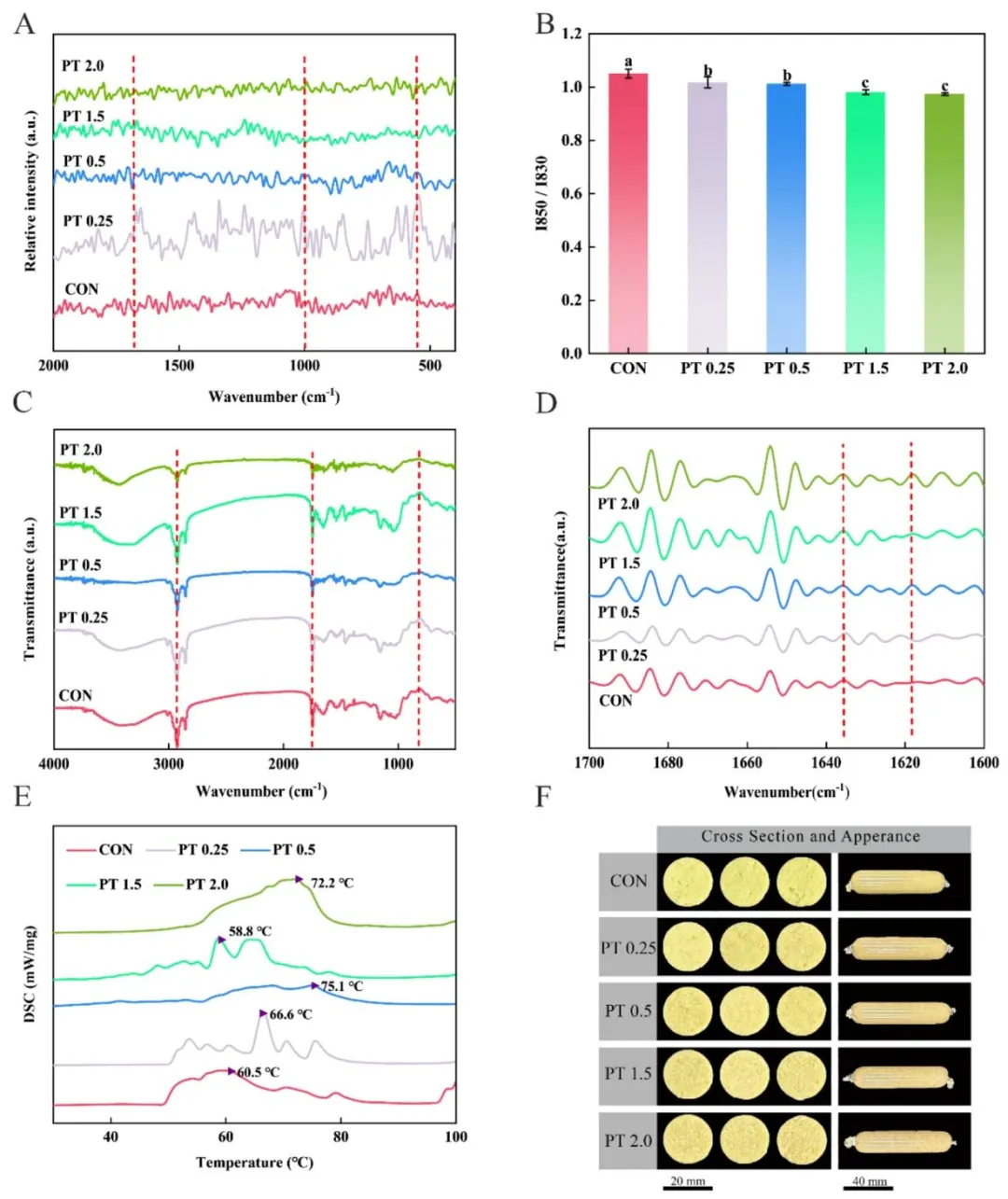 图 2 不同添加量柿单宁鱼糜凝胶的拉曼光谱 (A)、I850/I830 强度比 (B)、傅里叶变换红外光谱 (4000–500 cm⁻¹)(C)、酰胺 I 区 (1700–1600 cm⁻¹)(D)、差示扫描量热曲线 (DSC)(E)以及截面与外观形貌 (F)。