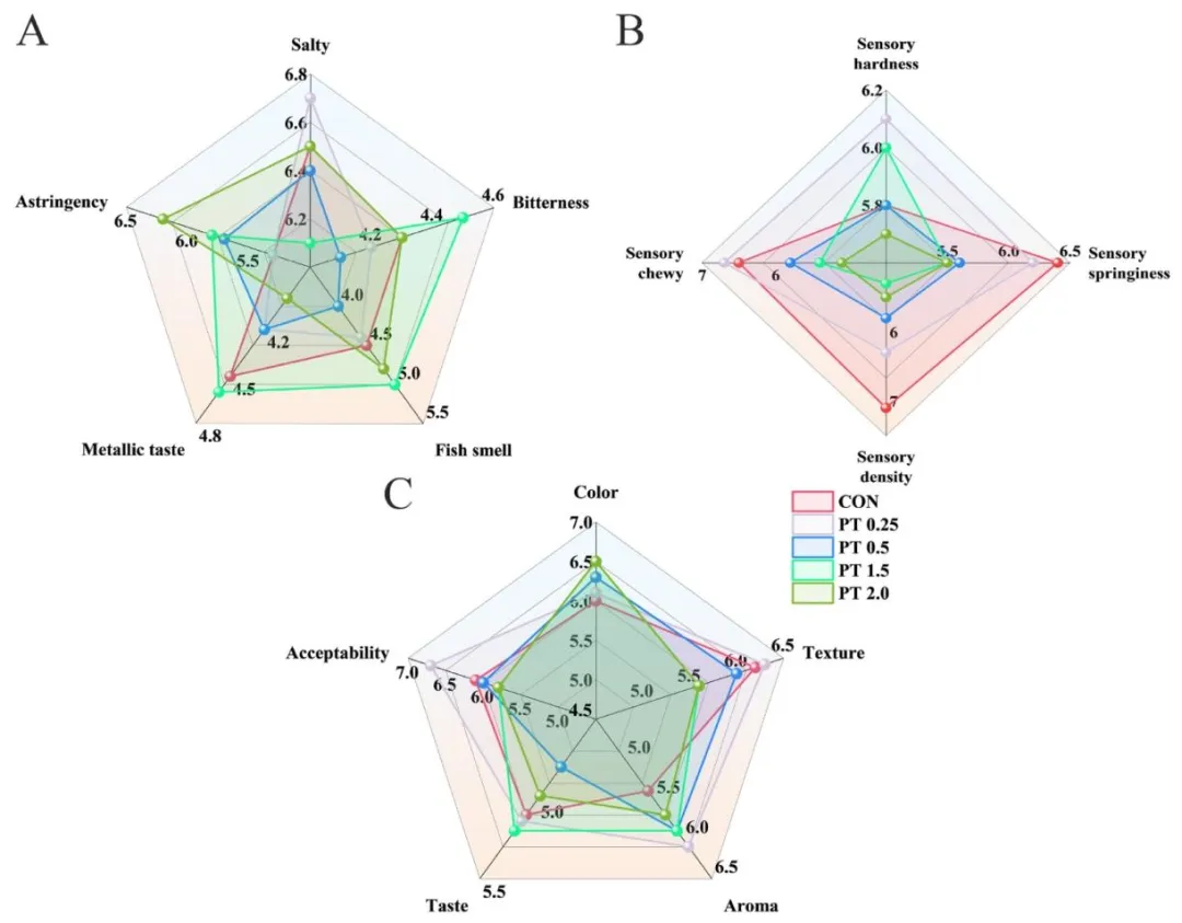 图 4 不同添加量柿单宁鱼糜凝胶的味觉感官评价 (A)、质构感官评价 (B)及感官轮廓图 (C)