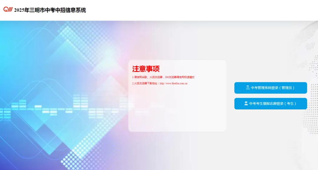 4.特别提醒:考生在填报志愿前,应认真阅读2025年新的招生政策规定、院校招生简章、三明市中招办(职业院校类)及当地招考机构公布的志愿填报注意事项,认真听取相关专业人士指导,慎重选择填报学校和专业,确保信息准确,并妥善保管好志愿填报账号和密码。因考生本人志愿填报失误造成的后果,由考生本人承担。由于考生个人原因,发生账号和密码被盗,造成信息泄露、志愿被冒充填报或修改,责任由考生自负。
